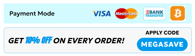 Choose the preferred payment method. Visa, Master and Bitcoin. Those who choose to pay with cryptocurrency can enjoy added discounts, free delivery and potentially additional medicine free of charge. You will receive an initial e-mail that will confirm the payment and the billing name on bank statements. A second email will be sent on dispatch that will confirm the estimated delivery time and the tracking ID assigned to the shipment.
